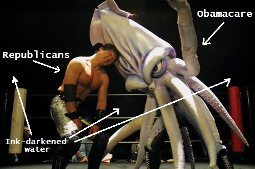 Also, I’m sorry to keep doing this, but “many-armed squid?” As opposed to what, Peggy? A few-armed squid? Is there a class of squid with fewer than eight arms that I’m not aware of? A type of squid that’s not as proficient at wrestling? Or did you just feel the need to clarify that the OBAMASQUID being wrestled by Republicans has not been UTTERLY dismembered?